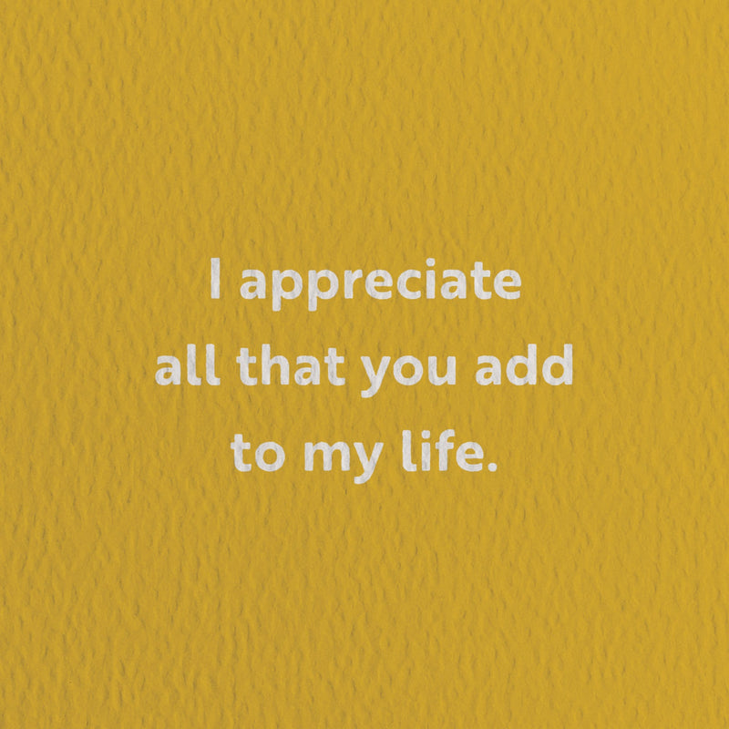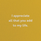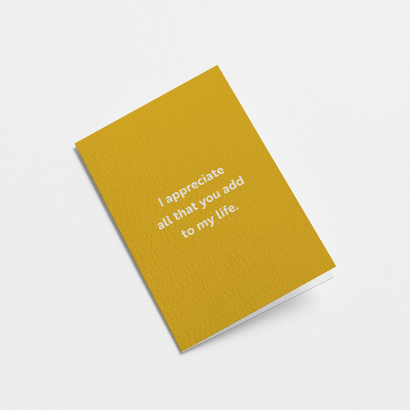 From our Thank You Cards Collection, this lovely “I appreciate all that you add to my life” card is perfect to express your gratitude! Warm their hearts with a unique thank you card from Graphic Factory. Proudly made in Britain.