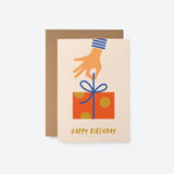 Birthday card with a hand holding a gift box from above with a text that says happy birthday