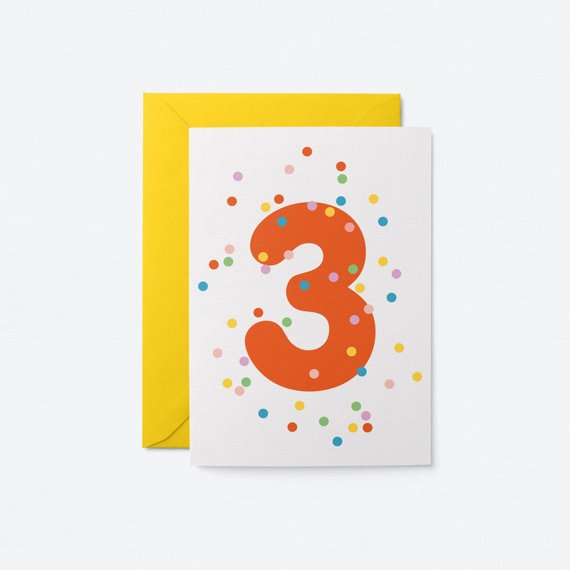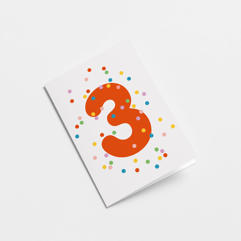 3rd birthday age card with colorful confetti and red number 3