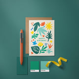 Birthday card with colorful leafs and a yellow sun figure with a text that says happy birthday